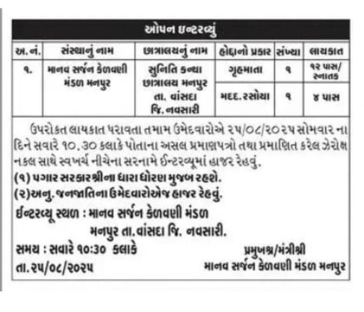 ઈન્ટરવ્યૂનું સ્થળ માનવ સર્જન કેળવણી મંડળ, મનપુર, તા. વાંસદા, જી. નવસારી છે. ઈન્ટરવ્યૂ સોમવાર, તા. 25/08/2025ના રોજ સવારે 10:30 વાગ્યે યોજાશે.